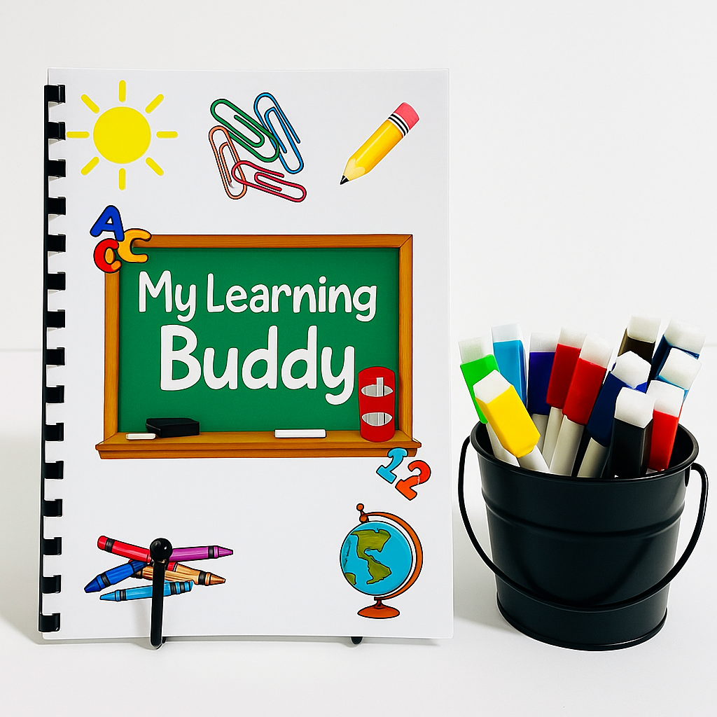 Our Learning Buddy is an on the go learning booklet with up to 17 activities to help your little learner continue to practice and master daily skills while having fun as well.